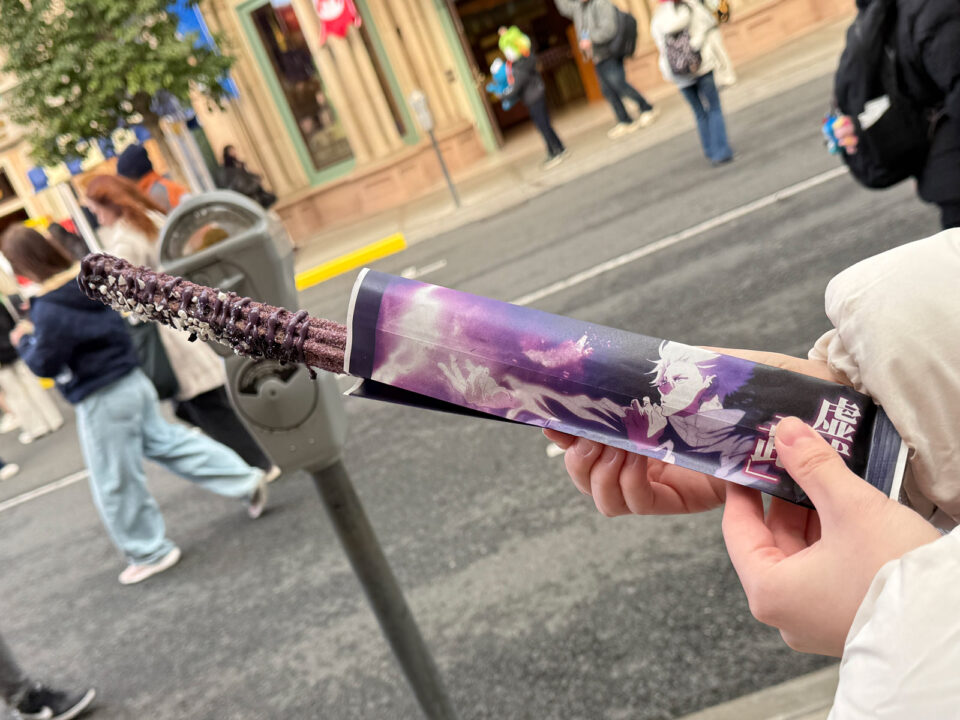 ハリウッド・エリア「シネマ 4-D」前のフードカートで販売されている『呪術廻戦』のコラボチュリトス。五条悟の強力な虚式「茈」を模したデザインで、見た目はちょっと…禍々しい!?