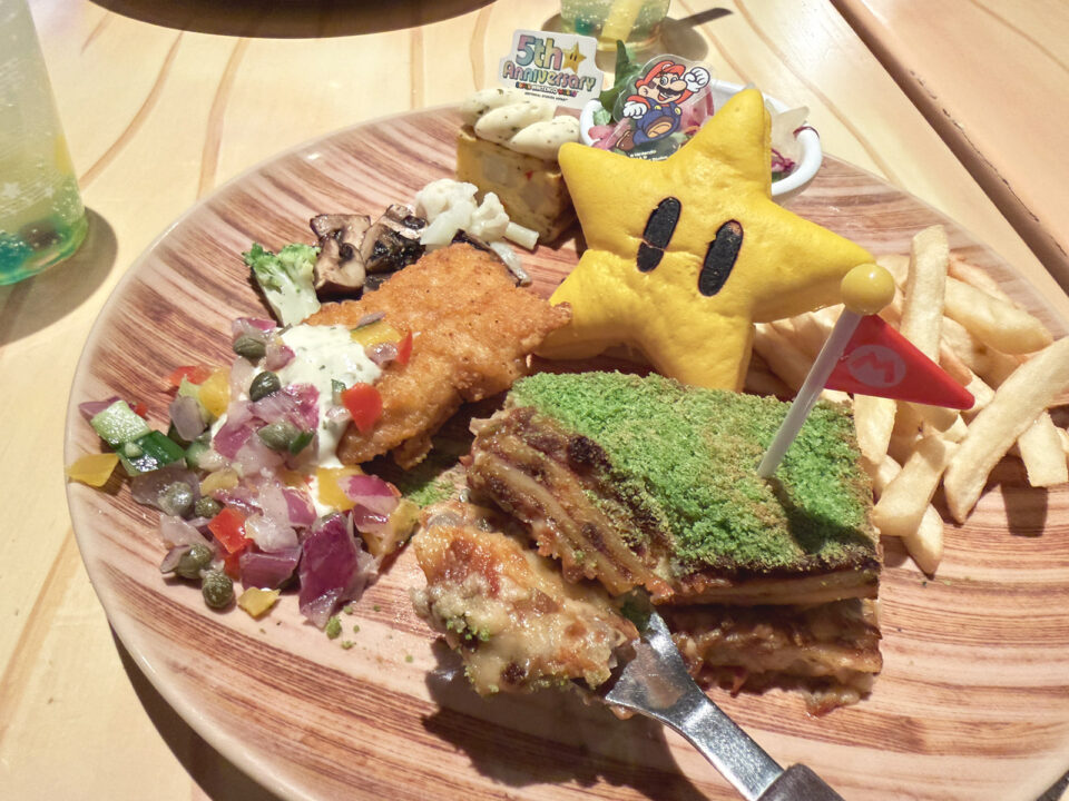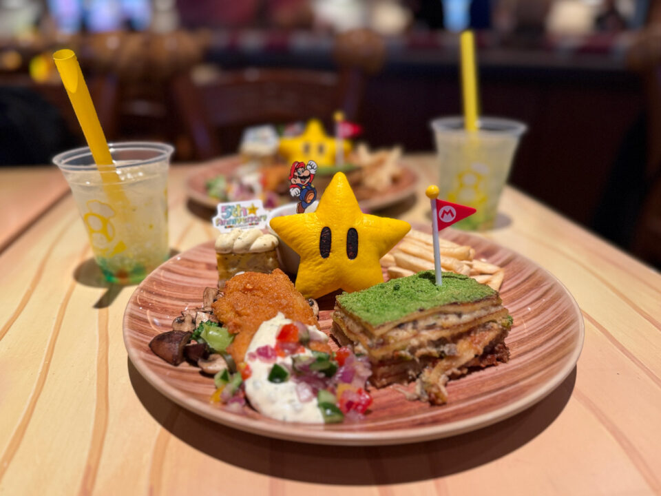 スーパー・ニンテンドー・ワールド™限定! エリア内「キノピオ・カフェ™」に登場した5周年記念メニュー「スーパースター・アニバーサリープレート ~マッシュルーム・ラザニア&フライドチキン~」。