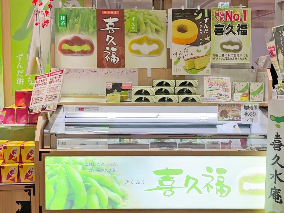 仙台駅に戻ったら、まずはおみやげを物色。仙台市在住の友人に聞くと口を揃えておすすめしてくれる「喜久福」と冷凍ずんだ餅をゲット。ご当地お菓子もたくさんあります。ずんだ好きの我、大歓喜。